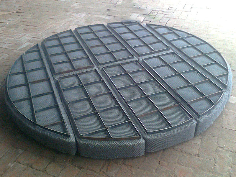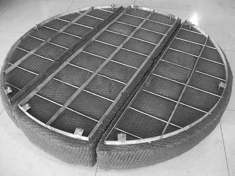 丝网除沫器主要是由丝网、丝网格栅组成丝网块和固定丝网块的支承装置构成,丝网为各种材质的气液过滤网,气液过滤网是由金属丝或非金属丝组成。气液过滤网的非属丝由多股非金属纤维捻制而成,亦可为单股非金属丝。该丝网除沫器不但能滤除悬浮于气流中的较大液沫,而且能滤除较小和微小液沫,广泛应用于化工、石油、塔器制造、压力容器等行业中的气液分离装置中。