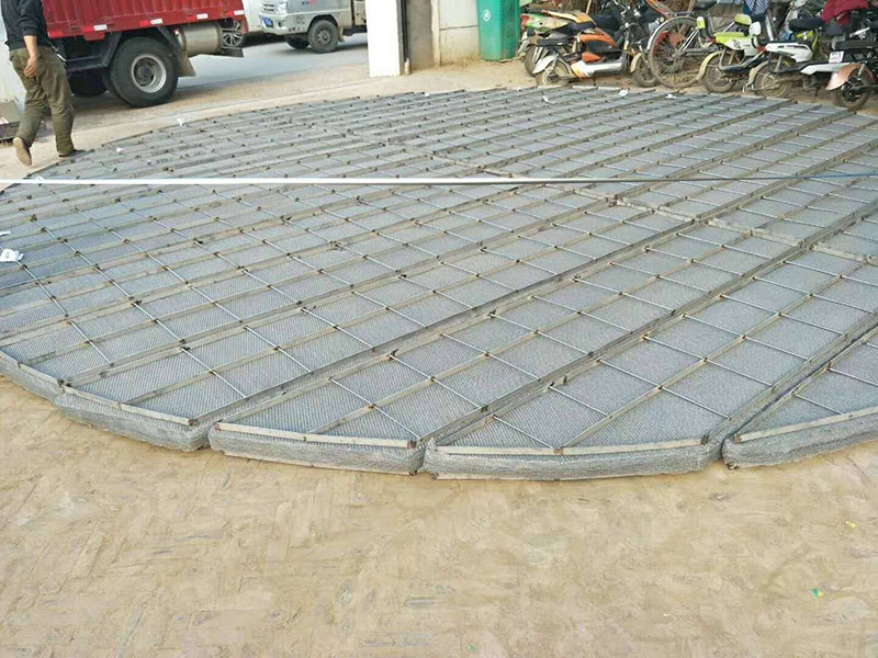 丝网除沫器主要是由丝网、丝网格栅组成丝网块和固定丝网块的支承装置构成,丝网为各种材质的气液过滤网,气液过滤网是由金属丝或非金属丝组成。气液过滤网的非属丝由多股非金属纤维捻制而成,亦可为单股非金属丝。该丝网除沫器不但能滤除悬浮于气流中的较大液沫,而且能滤除较小和微小液沫,广泛应用于化工、石油、塔器制造、压力容器等行业中的气液分离装置中。
